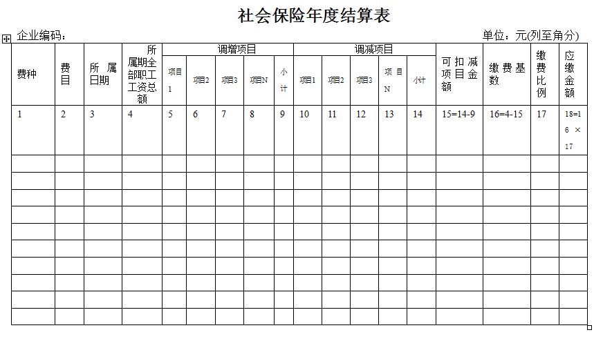 4、表中需结算的费种、费目从《社会保险年度结算表》中有结算标记的项目中取得,并按各地的维护设置产生第3列、第17列;