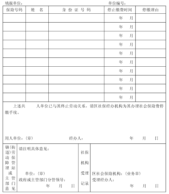2、单位必须在终止职工劳动关系的当月24日前将此表送达社保机构,同时请按“停一补一”要求,办理相应人数的参保手续;办妥停缴业务后,职工与单位中断社保关系;