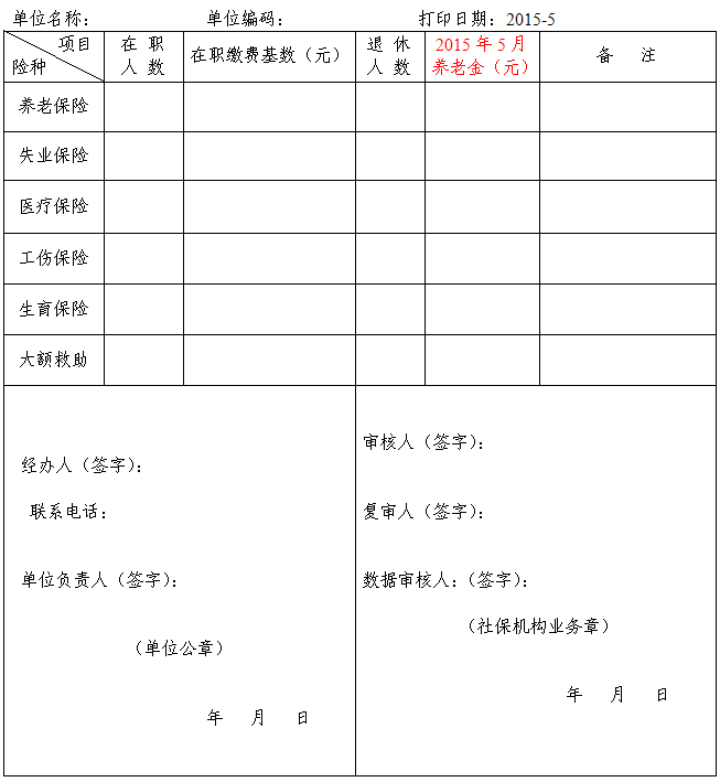 2、不在社保中心参加养老保险而参加其他险种的上属企业,需填写在职人数、在职缴费基数、退休人数三列。