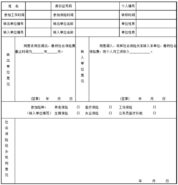 1、此表一式三份,调入、调出单位及社会保险经办机构各一份,社会保险关系转移应在调动当月办理。