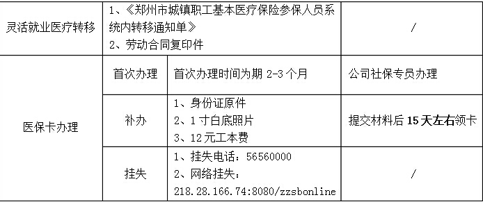 2、医疗保险常见的问题包括:郑州某区医疗转移、河南省医保转移、居民转职工(大学生医保、普通居民医保)、灵活就业、医保卡新卡办理、挂失及补办。