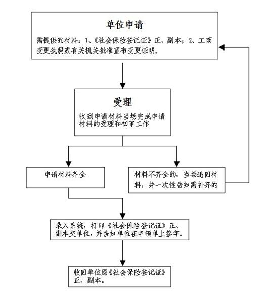 社保经办机构社保登记管理部门对参保单位申请变更登记的相关材料进行审核,审核无误后,办理单位变更登记,涉及社会保险登记证内容变更的,换发新的《社会保险登记证》,同时收回原发的登记证,对收回的原登记证加盖 “作废”字样。